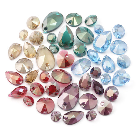 縫い付け用のパーツです。洋服やバッグ等に縫い付けたり、ビーズのようにアクセサリーにも使用できます。フォイル加工がないため、透明感が際立ちます。
