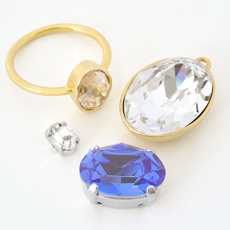 専用の石座に留めたり、ビーズで周りを囲むように編んだりして使用します。(F...フォイル加工あり unf...フォイル加工なし)