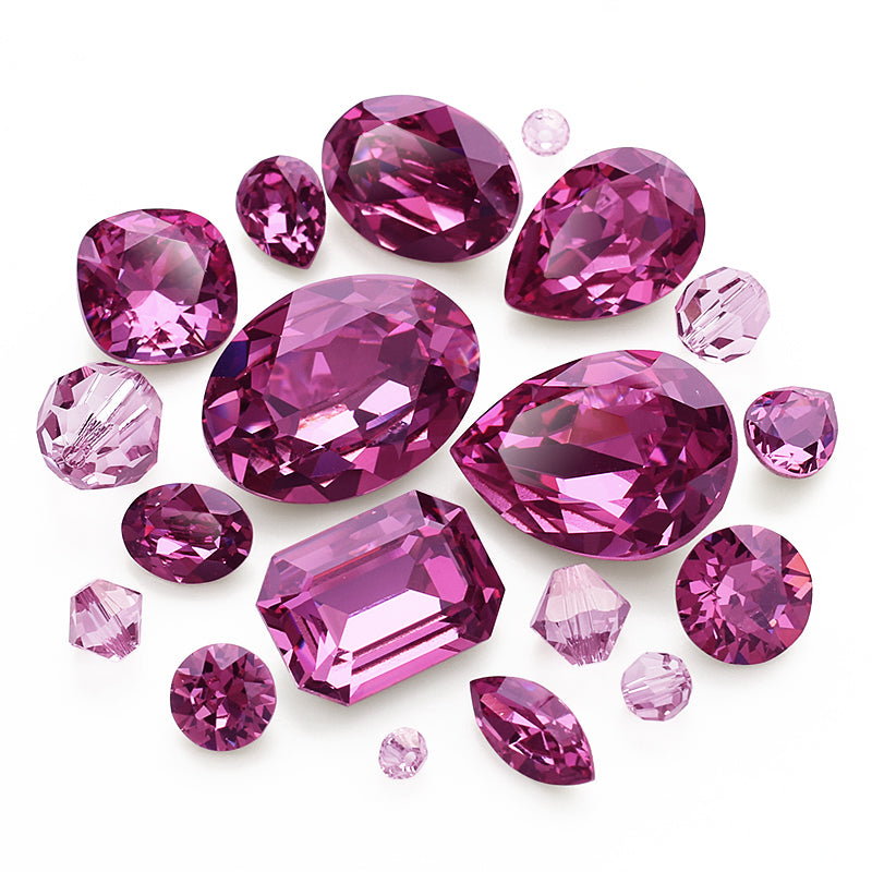 ダークローズは、科学熱処理HICT(Heat Induced Color Technology)を加えることで石の中に着色層を焼き付けています。フォイルのある1000番台・4000番台と比べて、ビーズ・トップホールタイプは淡い色味をしています。専用の石座に留めたり、ビーズで周りを囲むように編んだりして使用します。(F...フォイル加工あり unf...フォイル加工なし)