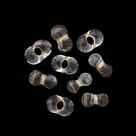 中央を少し絞った蝶のような丸いシルエットで、通し穴が1つ開いています。テグスなどに通すとビーズが交互に重なり、編んだような立体感が楽しめます。通し穴に金色のメッキが施されています。