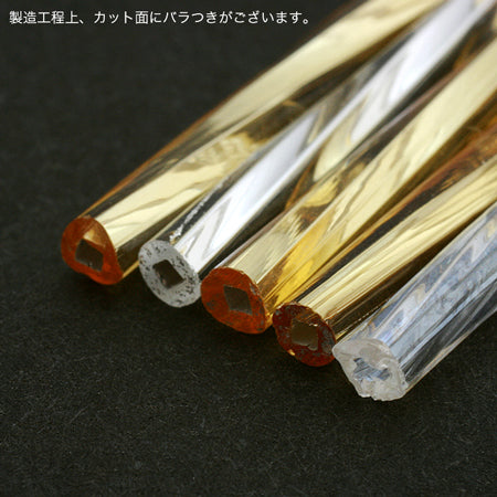 外側は円柱状、四角い通し穴が中でツイストしています。穴にはシルバーラインが施されています。テグスやピン類などを通してご使用ください。