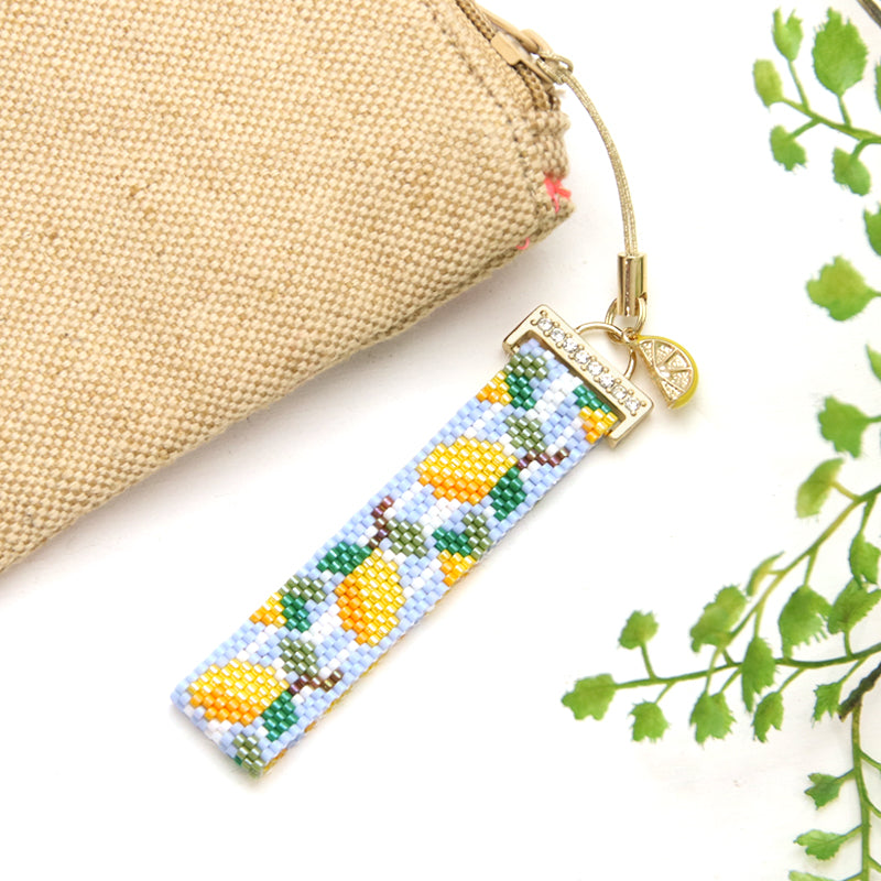 爽やかなストライプ柄に丸ごとレモンのイエローが映えるデザインです。裏面はレモンスライスのデザインで、どちらの面を主役にしても可愛いリバーシブルなデザインになっています。ペヨーテステッチで繰り返し模様を編んで作るので、ビーズステッチのテクニックを学びたい初心者の方にもおすすめです。