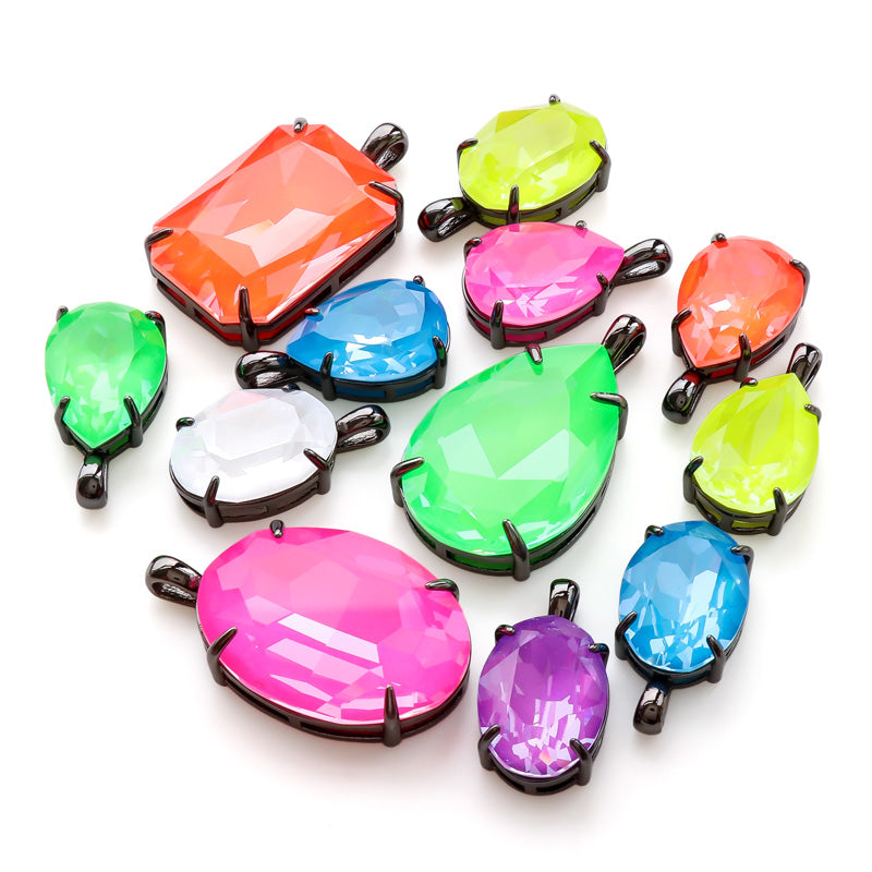専用の石座に留めたり、ビーズで周りを囲むように編んだりして使用します。裏面に施したラッカーの内側にイグナイトエフェクトを施しています。ホワイトカラーのラッカーと宝石のような煌めきのイグナイトエフェクトがカット面を際立たせ、表面の光沢感と透けて見えるカラーがフレッシュでパワフルな雰囲気です。暗闇でブラックライトを当てると発光します。