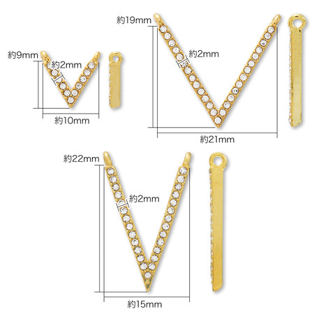 素材は亜鉛合金です。厚さは約2.2mmでカンのサイズは約9×10mmが約0.7×2.4mm、その他が約0.8×3mmです。カンには約9×10mmが線径0.8mm以下の丸カンやCカン、その他が線径1.2mm以下の丸カンやCカンが使用できます。(丸カン0.5×2.3mm(洋白)はサイズが合わないため使用できません。)チェーンやパーツの間に入れてアクセントとしてご使用ください。サイズによりV字の形状が異なります。