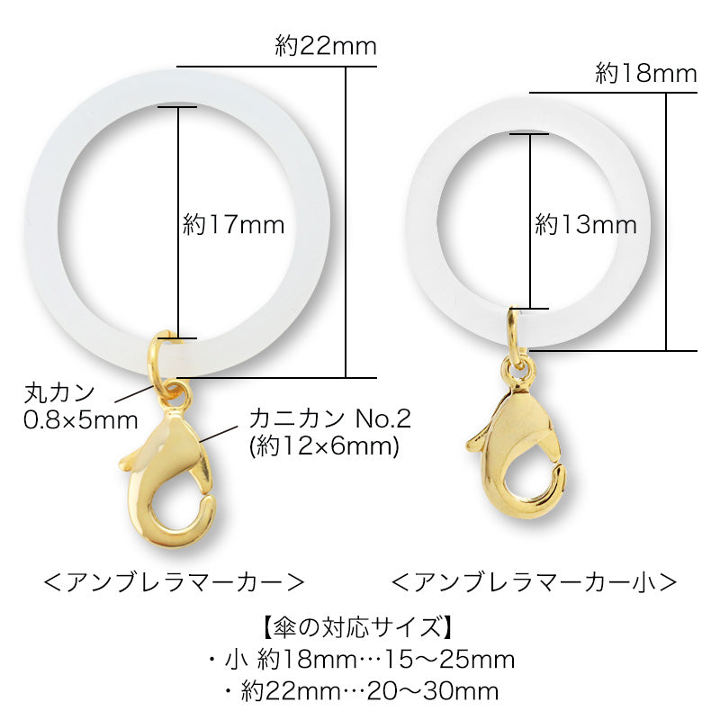 シリコンゴム部分を傘の持ち手などに取り付けて使用できます。カニカンが付いているので簡単にチャームなどをつなげて傘を可愛くアレンジできます。自分の傘の目印になるので、傘の取り違えや盗難を防ぎたいときに便利です。22mmはペットボトルマーカーとしてもおすすめです。