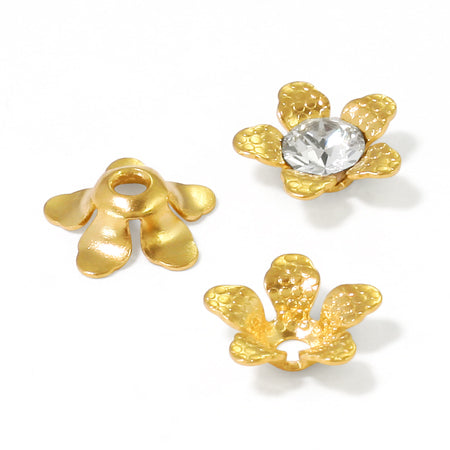 The material is brass. A design is applied to the surface. You can attach Kiwa Crystal #1088 or round ball single hole parts to the center using adhesive.