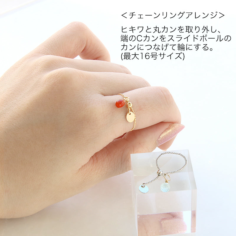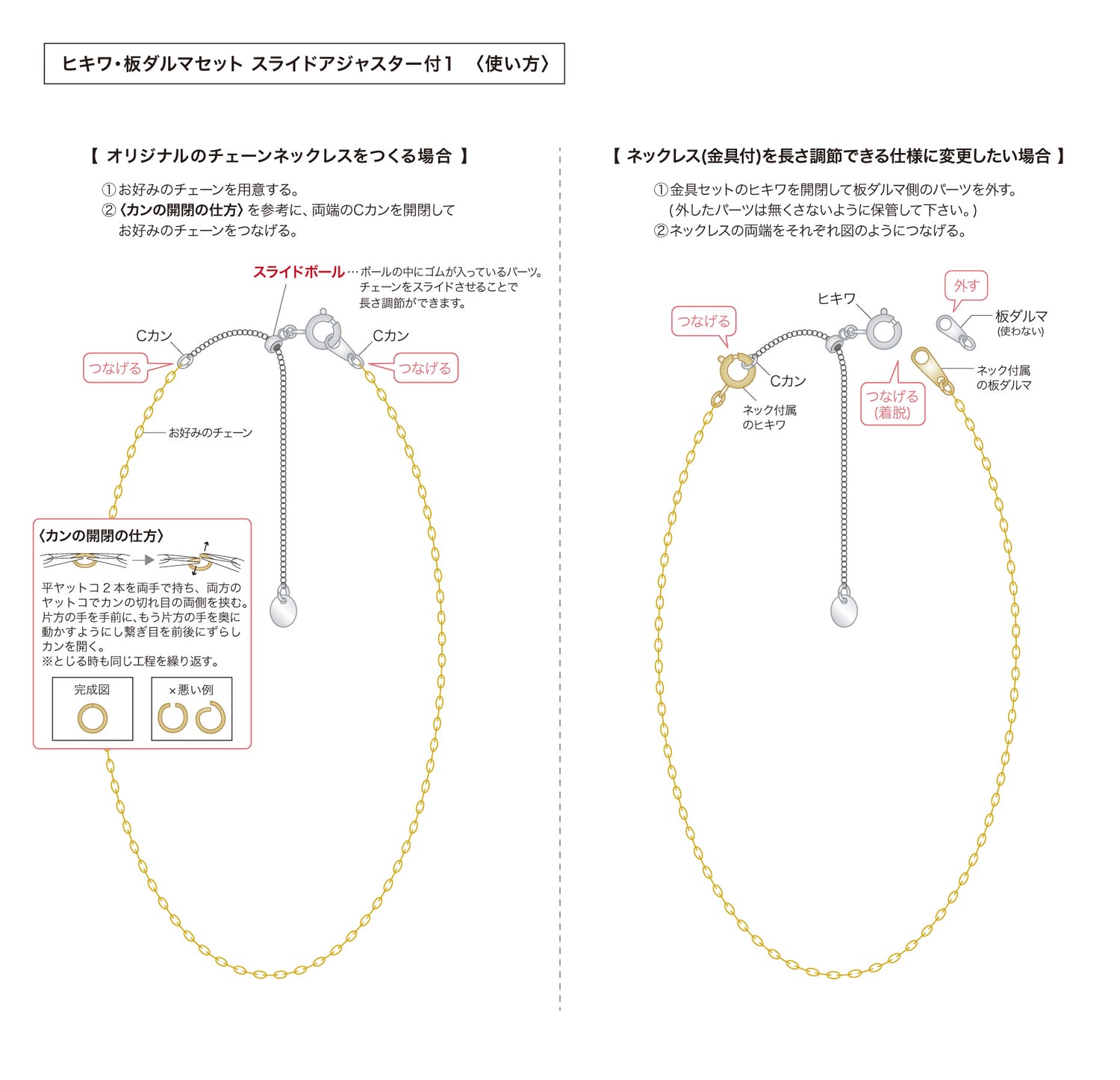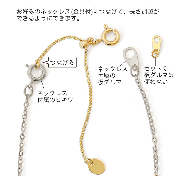 It is an original product of Takawa Seisakusho. A set of fastening fittings required to make accessories is a set. The sculpture of the chain (up to 6cm) can be adjusted freely because the scallops have a slide adjuster of siliconball. Open and close both ends and connect them to your favorite chain to create an original chain necklace. In addition, you can connect to your favorite necklace (with bracket) to adjust the length. It is also recommended to arrange it as a chain ring like an image.
